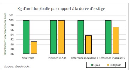 Dans cette étude, des balles rondes ont été confectionnées et la valeur alimentaire a été déterminée une première fois à la récolte et une seconde fois après 300 jours. Les balles non traitées contenaient 9 % d'amidon en moins après 300 jours. Les balles traitées avec 11A44 n'ont pas perdu d'amidon.