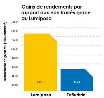 Lumiposa a une très bonne efficacité contre les larves de taupins, même en cas de fortes infestations. La larve de taupin ou encore appelée « ver fil de fer » est issue de l’insecte adulte (Agriotes) appartenant aux Coléoptères. Le traitement avec Lumiposa donne de bien meilleurs résultats que la téfluthrine 20CS. Sur 27 essais, on a observé 50 % de dégâts en moins par rapport au non traité et 16,3 % de dégâts en moins par rapport au traitement avec téfluthrine 20CS. Lumiposa en traitement de semences de maïs a été reconnu efficace contre les larves de taupins et les vers gris (chenilles de noctuelles - Agrotis).