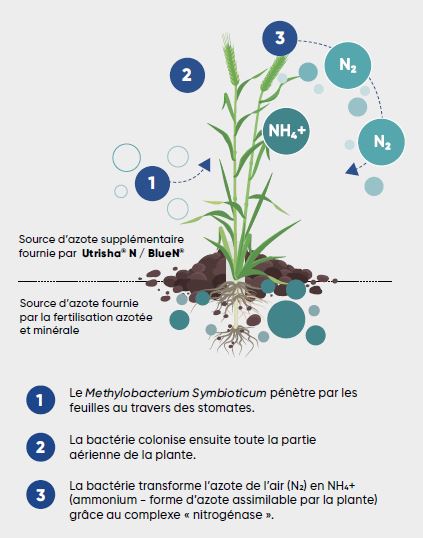 Utrisha® N / BlueN® sont des solutions innovantes et très tendances dans le domaine de la fertilisation azotée. Ces biostimulants sont capables de fixer l’azote atmosphérique et de le transformer en azote assimilable par la culture. Cette nouvelle source d'azote, "énergie verte" est complémentaire aux apports organiques ou minéraux et peut remplacer en partie la fertilisation traditionnelle.