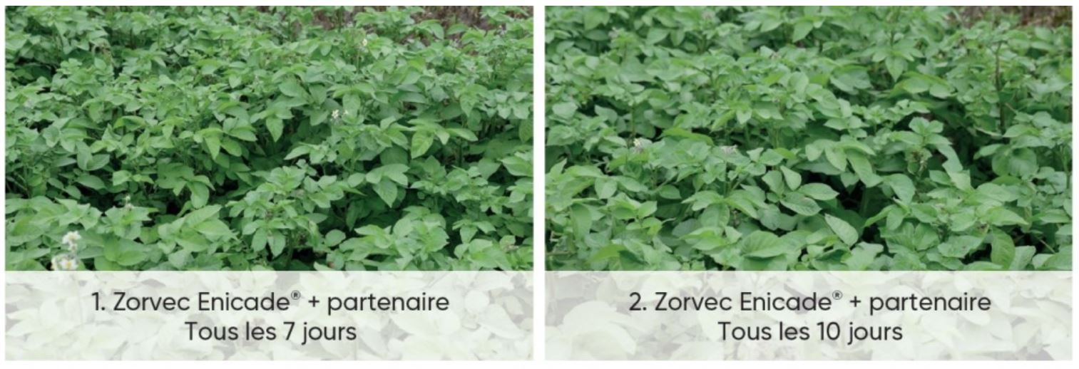 Zorvec Enicade et Endavia démontrent une excellente efficacité sur le mildiou de la feuille (note la plus élevée) et de la tige tout en protégeant les nouvelles feuilles.