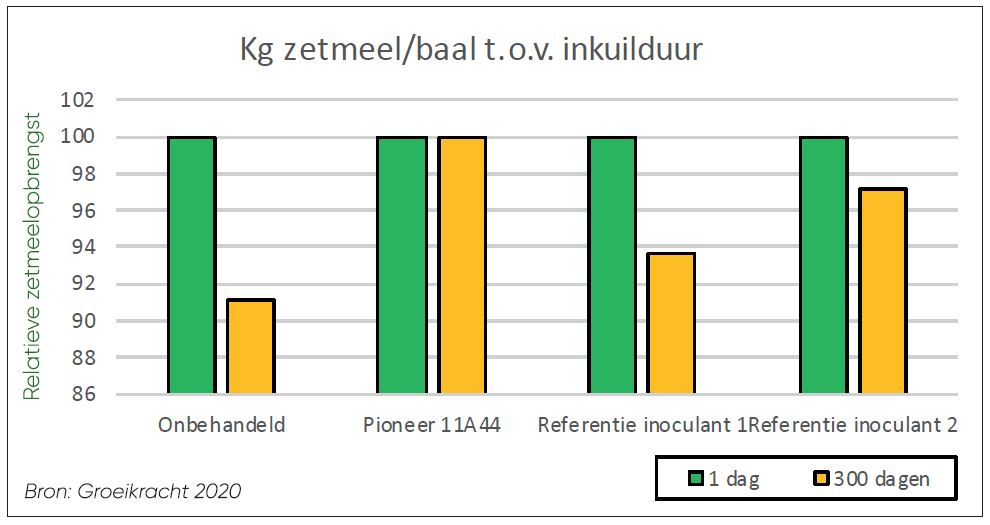 De balen behandeld met 11A44 verloren geen zetmeel. Mais dat is ingekuild met inkuilmiddel 11A44 verliest tijdens de bewaring geen zetmeel.