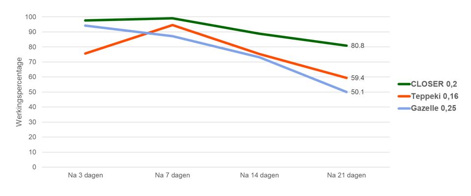 Bovenstaande grafiek toont enerzijds de snelle en efficiënte werking van Closer (3 dagen na toepassing) alsook zijn lange duurwerking. (Demoproef op aardappeltopluis, Botany NL 2020).