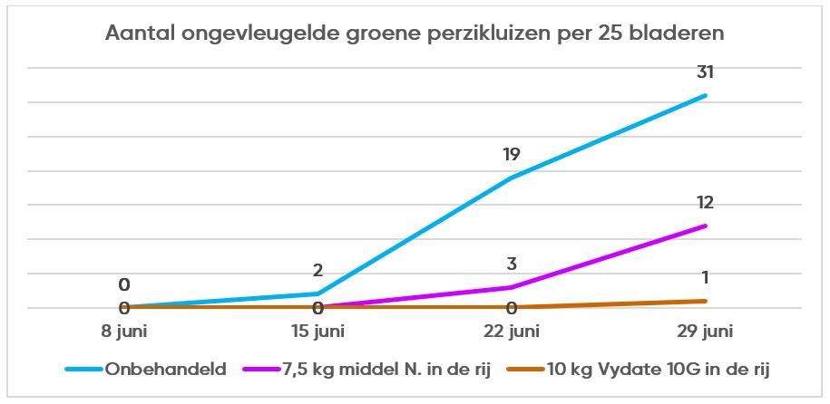 In 2020 is onderzoek gedaan naar de luiswerking van de twee beschikbare granulaten. Het onderzoek is uitgevoerd door Proeftuin Zwaagdijk (NL). Na opkomst werd wekelijks het aantal luizen per 25 samengestelde bladeren geteld. Hieronder ziet u de resultaten. De opkomstdatum was 5 juni.