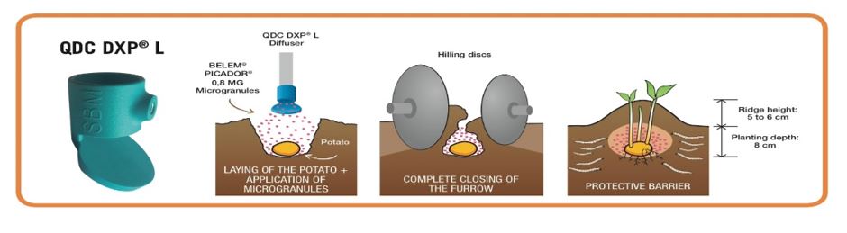 Onderstaande figuur laat dit goed zien. De verdeling vindt plaats met de specifieke verdeler, waardoor het product ‘breed’ in het bed wordt verdeeld. Na het dichten van het bed, zit SHERPA 0.8 GR goed verdeeld rondom de aardappel om zo een barrière te vormen tegen de ritnaalden.