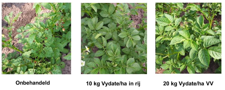 Daarnaast zien we in onze proefvelden met Vydate ook steeds duidelijke verschillen in de aantasting door Coloradokevers.