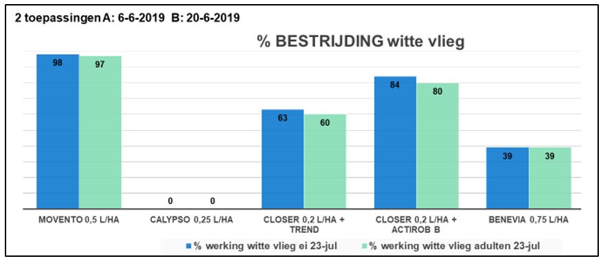 CLOSER heeft een erkenning aan 200 ml/ha, dit betekent dat de 'witte vliegdosis' (400 ml) niet erkend is in kolen. Toch heeft CLOSER ook aan de “luisdosis” een goede nevenwerking tegen witte vlieg (Sint-Katelijne-Waver, 2019) :