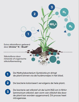 Utrisha® N / BlueN® bevat de bacterie Methylobacterium Symbioticum. Deze bacterie is in staat om stikstof (N2) uit de lucht te binden. Dit proces heet nitrogenase. Dit is hetzelfde proces als waarmee vlinderbloemigen, zoals erwten, bonen en klaver, stikstof uit de lucht binden. Bij vlinderbloemigen gaat het alleen om een andere bacterie, namelijk de Rhizobium bacterie.