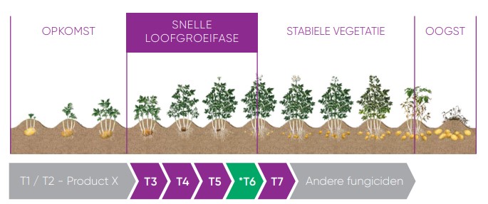 We adviseren eerst 1 á 2 bespuiting met een standaardmiddel totdat het gewas aan de snelle loofgroeifase begint. Vervolgens drie bespuitingen met een verlengd spuitinterval met Zorvec Enicade® i.c.m. een partnerproduct. Daarna schakelt u weer over naar een standaardmiddel.
