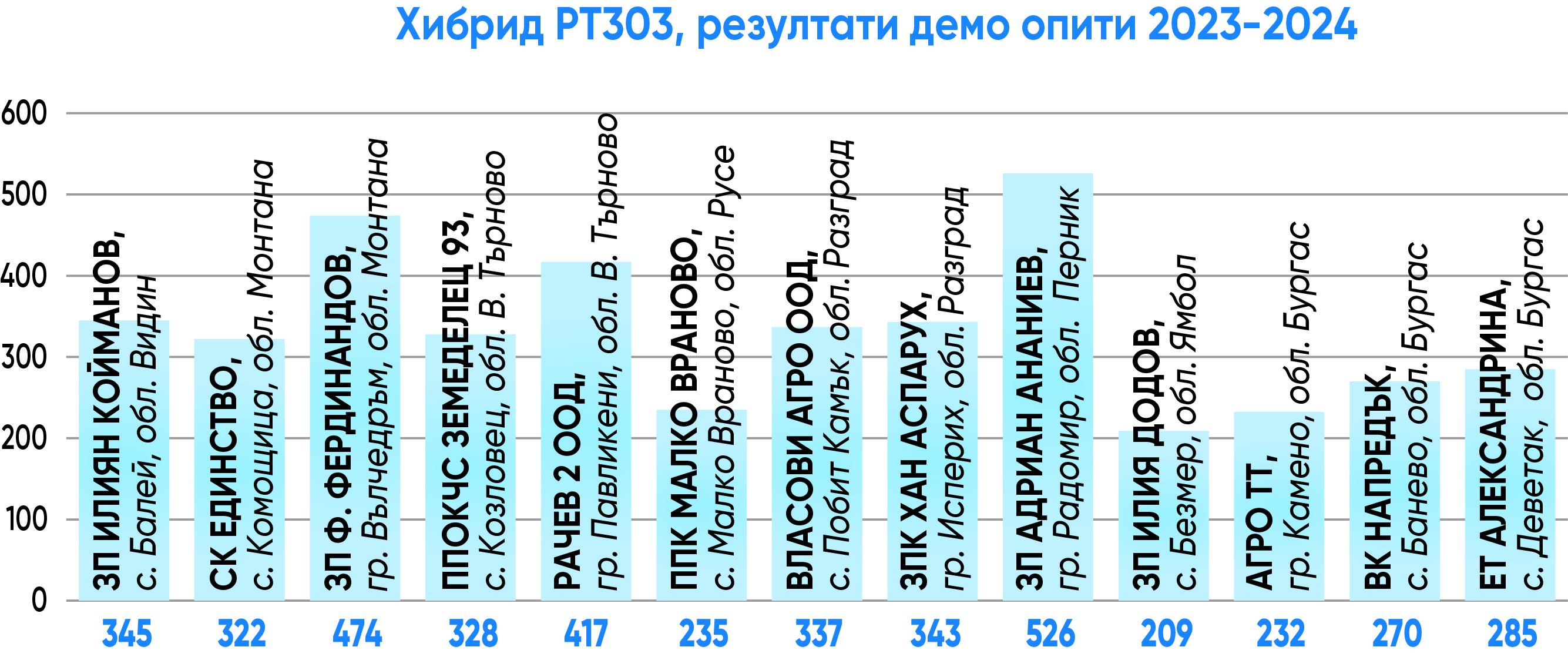 Другите нови хибриди на Corteva, успешно внедрени в практиката в България от 2022 година, които се отчетоха с подобаващи високи резултати са РТ302 и РТ303.
