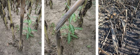 Сухо склеротийно гниене по слънчогледаФигура 1. Общ изглед на растения, заразени с Macrophominaphaseolina