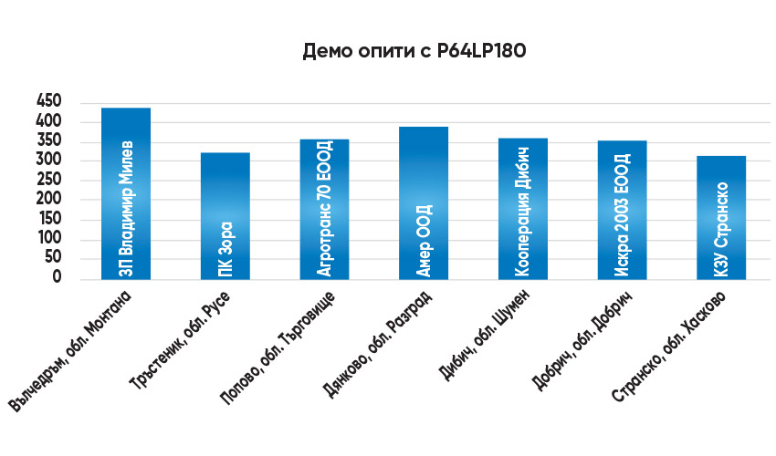 P64LР180 също е нов средноранен хибрид, Clearfield® Plus версия на отглеждан и известен ExpressSun® хибрид в страната. С висок и стабилен добивен потенциал при нормални условия, ранен цъфтеж и подходящ за отглеждане основно в Северна България. С компактни еднакви хомогенни пити, и изравнени зърна във всички части на питата. Добър здравен статус, високо маслено съдържание и Pioneer Protector® синя китка – устойчив на всички раси синя китка, идентифицирани до момента в страната, което позволява да се пропусне пръскането с имазамокс съдържащи хербициди срещу паразита. През 2021 година P64LР180 беше изпитан на демонстрационни опити в България, като в приложената графика можете да видите получените високи добиви, а също така и в каталога с добиви от демо опити и производствени полета 2021 година.