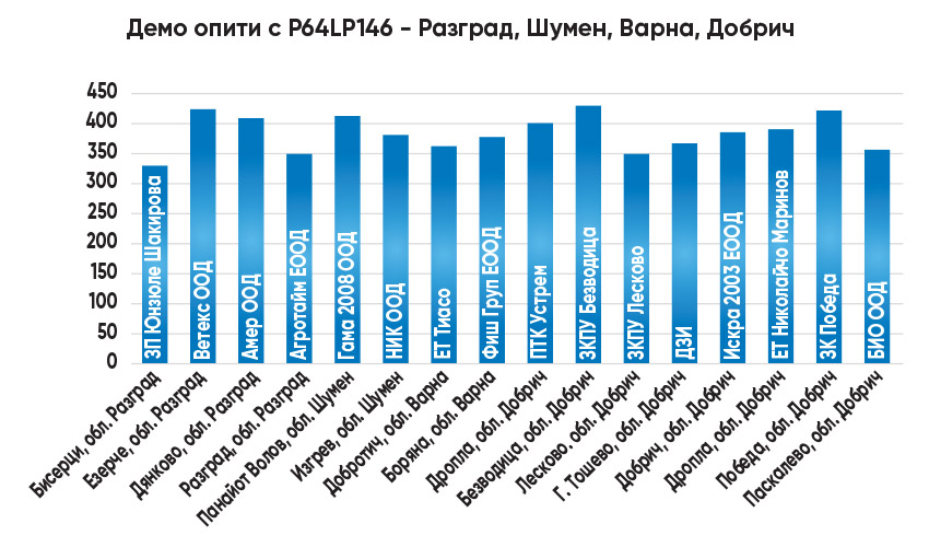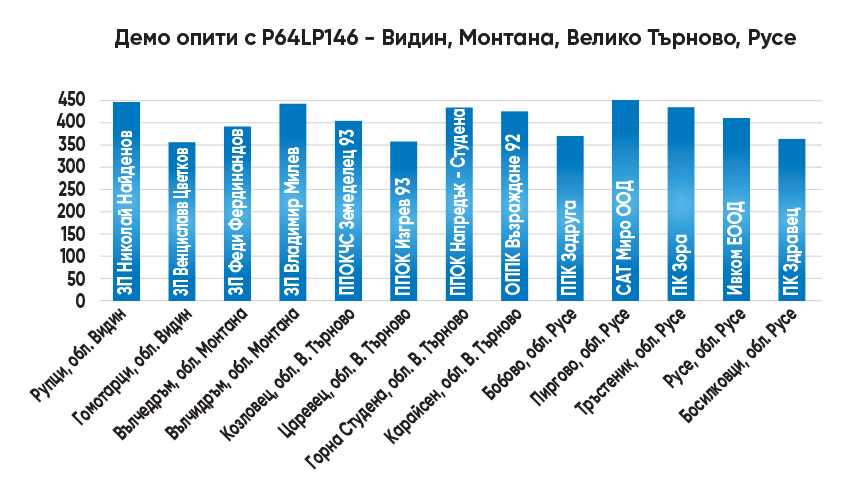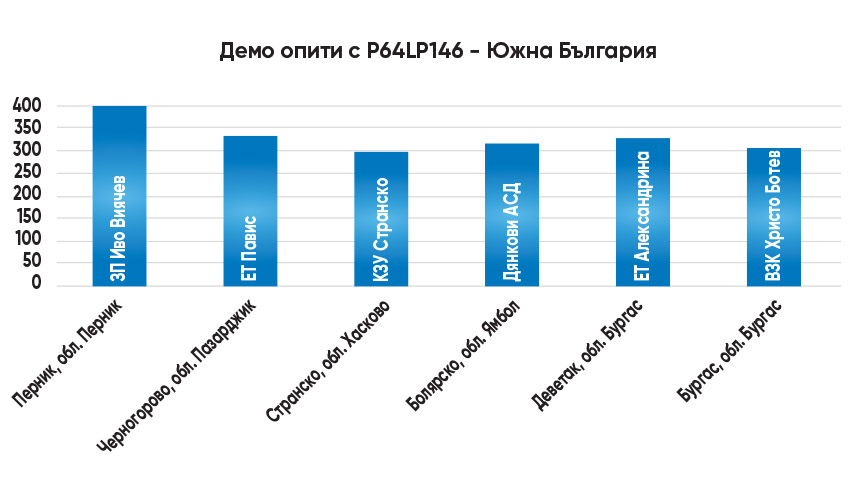 P64LР146 също е нов средноранен Clearfield® Plus хибрид. С повишен добивен потенциал при нормални и лимитирани на влага условия. Много добра толерантност на лимитирани условия на влага. Подобрен фитосанитарен профил срещу икономически важни болести, високо маслено съдържание и Pioneer Protector® синя китка – устойчив на всички раси синя китка, идентифицирани до момента в страната, което позволява да се пропусне пръскането с имазамокс съдържащи хербициди срещу паразита. През 2021 година P64LР146 беше изпитан на демонстрационни опити в България, като в приложената графика можете да видите получените високи добиви, а също така и в каталога с добиви от демо опити и производствени полета 2021 година.