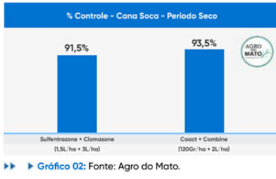 Trabalhos da consultoria Agro do Mato, especializada em manejo de plantas daninhas em cana-de-açúcar, mostram a eficácia do controle Coact associado ao Combine, aplicado em julho de 2020, para a planta daninha Ipomoea triloba. Entregando 93,5% de controle aos 150 DAA, mesmo sob condições de restrição hídrica na região de Rio Claro, interior de SP, em solo de textura leve