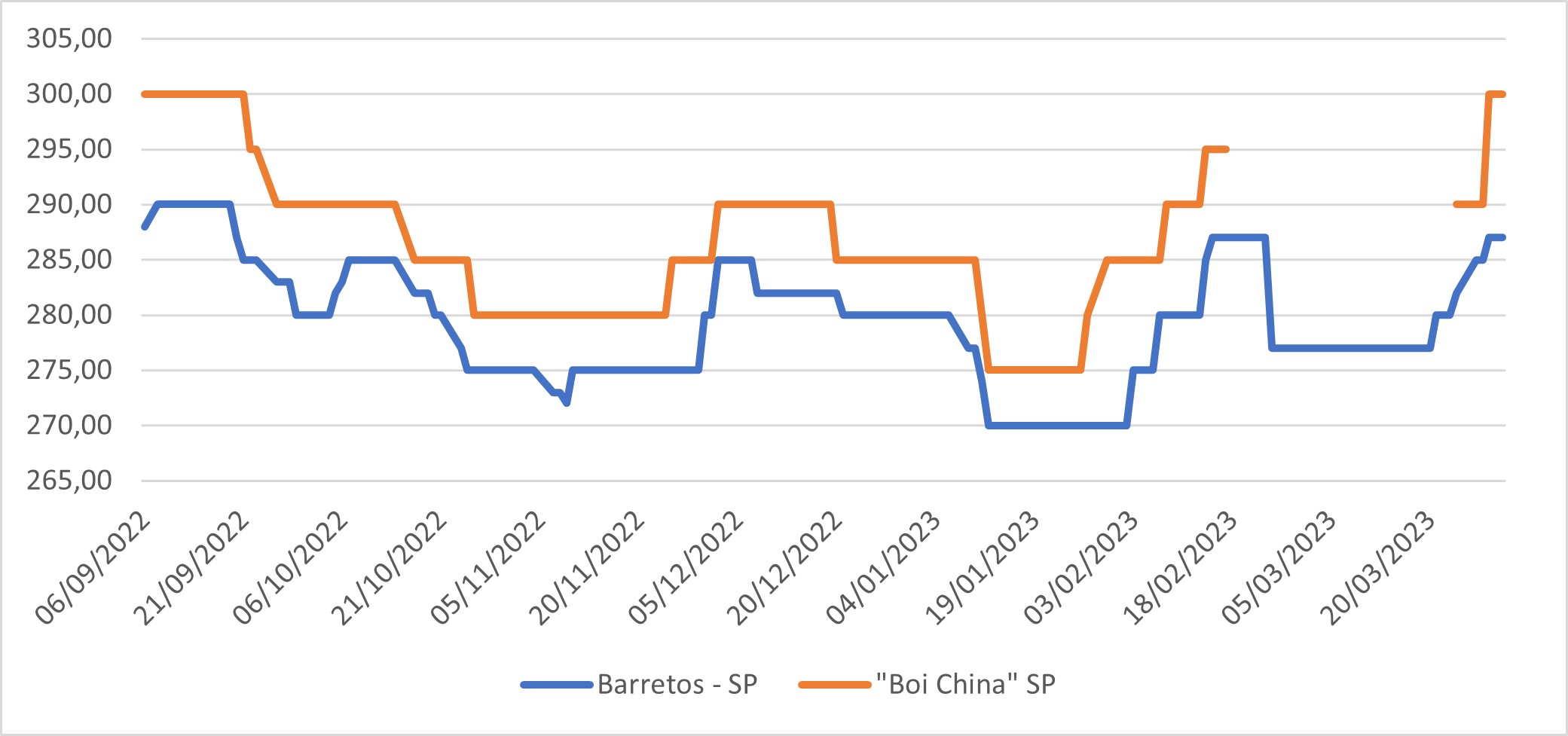 Após o anúncio, o mercado foi reagindo aos poucos. A referência paulista para o boi gordo reagiu e, até 31 de março, subiu R$ 7,00/@. A cotação do “boi China” voltou a existir, o frigorífico está pagando um ágio pelo bovino com até 4 pares de dentes. A referência é de R$ 300,00/@ em São Paulo. Veja o comportamento dos preços do boi gordo (R$/@), em São Paulo, na figura 1.