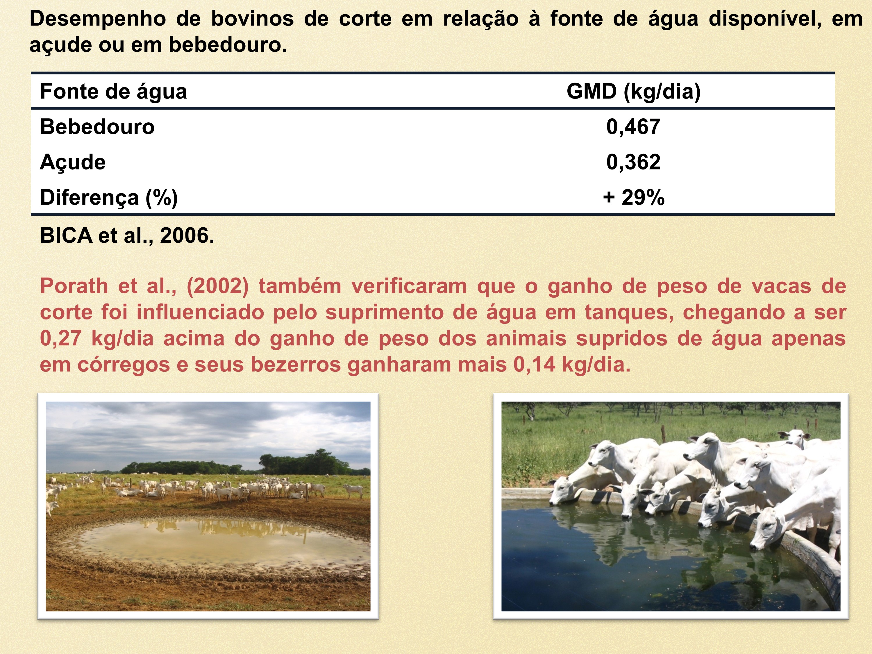 No primeiro teste, os animais de recria foram separados em dois lotes. No primeiro, eles tinham acesso à água em bebedouro e ganharam 105 g/dia a mais, o que representou 39% a mais de ganho, em comparação com os animais do segundo lote, que beberam água em uma cacimba (água de chuvas e de enxurradas acumuladas em um buraco cavado pelo ser humano). Já no segundo experimento, vacas paridas com bezerros ao pé, que beberam água no bebedouro, ganharam 270 g/dia a mais do que as vacas que beberam água em um córrego (livre acesso). E os bezerros das vacas que beberam água no bebedouro ganharam 140 g/dia a mais do que os bezerros das vacas que beberam água do córrego.