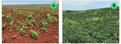 Controle o milho tiguera nos estágios iniciais da soja (imagem A) e não aguarde por maiores fluxos enquanto a soja está em estágios mais avançados (imagem B). Essa prática vai colaborar tanto para a produtividade da soja quanto para o controle da cigarrinha.