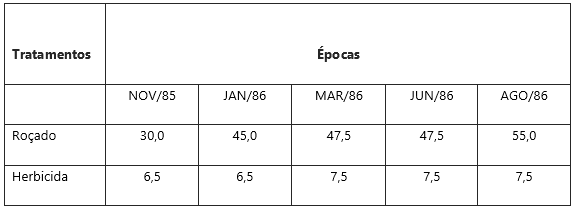 Na tabela 2, pode-se verificar o efeito dos métodos químicos (aplicação no toco) e controle manual (roçagem) realizado em pastagens de capim-colonião (Panicum maximum Jacq) na região Amazônica.