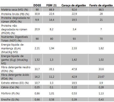 O DDG é um alimento rico em energia, proteína, extrato etéreo e enxofre (observar a tabela 1 abaixo). Uma característica importante do DDG é o alto teor de proteína não degradável no rúmen, muito superior aos outros alimentos abordados aqui, o que pode ajudar em formulações nas quais necessitamos de mais proteína metabolizável para os animais.
