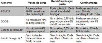 Uma das vantagens do caroço de algodão é que pode ser usado integral, sem necessidade de processamento. No entanto, pode ocorrer baixa ingestão no início do fornecimento e, por esse motivo, recomenda-se a mistura com alimentos mais palatáveis como milho, por exemplo. Os níveis de uso do caroço de algodão são mostrados na tabela 2, logo abaixo.