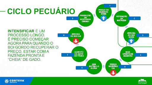 Quando há menor oferta de bezerros no mercado (9), os preços dessa categoria tendem a subir (1) e a atratividade pela produção de bezerros (cria), é maior, estimulando o produtor a reter matrizes (2) e reduzindo a oferta de bovinos para o abate – estimulando o preço do boi gordo (3).