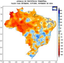 Índice de precipitação padronizada e anomalia de precipitação (mm) trimestrais, considerando setembro, outubro e novembro de 2024.