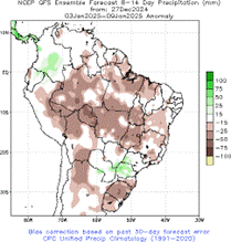 Anomalia de precipitação (mm) acumulada no Brasil em dezembro (27/11/24 a 26/12/24), à esquerda, e expectativa de anomalia de precipitação para o período entre 3 e 9 de janeiro de 2025, à direita.