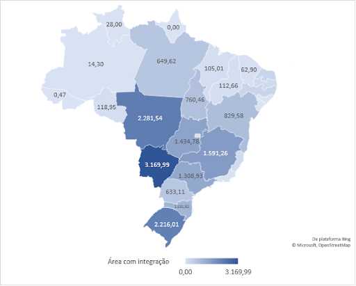 Destaque para o Mato Grosso do Sul, que detém 18,19% da área total de integração, com 3,17 milhões de hectares, seguido por Mato Grosso, com 2,28 milhões de hectares (13,09%) e Rio Grande do Sul, com 31,7% da sua área agropecuária com algum tipo de integração, e representa 12,71% da área total integrada brasileira, com 2,22 milhões de hectares (figura 1).