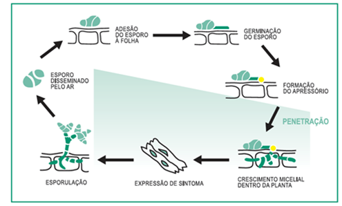 Trata-se de uma doença policíclica, que dura entre 5 e 7 dias. Isso indica que as fases de desenvolvimento do fungo ocorrem de forma concomitante, o que indica que ela já pode estar infectando a cultura mesmo antes dos sintomas serem vistos. O ciclo de vida da brusone tem as seguintes fases: