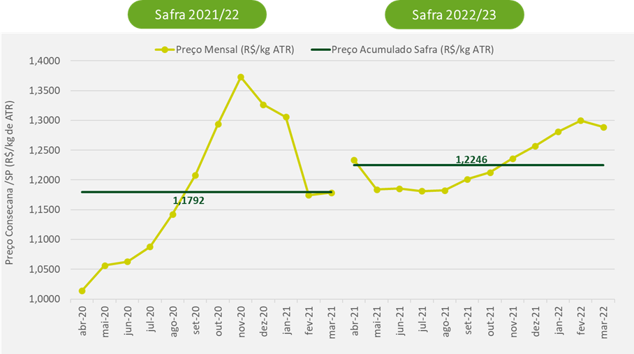 Figura: Preço Médio (acumulado) do Kg de ATR – Safra 2021/22 e 2022/23 – Consecana. Fonte: Canaplan; Bioagência.