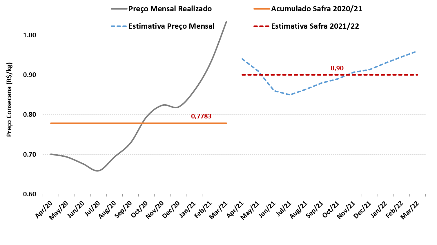 Gráfico 1: Projeção de Preços – São Paulo, CONSECANA ((R$/kg ATR –Safras 2020/21 e 2021/22). Fonte: Canaplan.