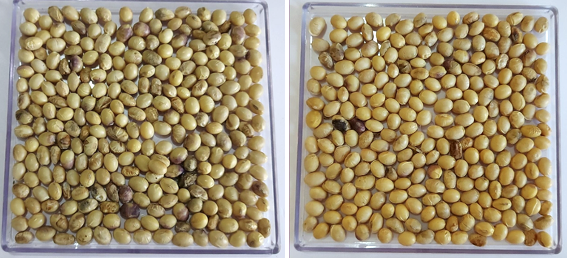 Grãos de soja com danos causados pelos diversos patógenos relacionados à podridão de vagens e grãos da soja. Tratamento testemunha, à esquerda, e tratamento com duas aplicações de Vessarya®, à direita.