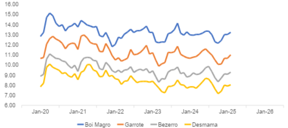 Ou seja, quando o real se enfraquece frente ao dólar, o repasse de preços da arroba do boi gordo na moeda estrangeira é limitado. Assim como aconteceu no fim de 2024, o enfraquecimento do real limitou a alta dos preços internacionais da arroba do boi gordo brasileiro.