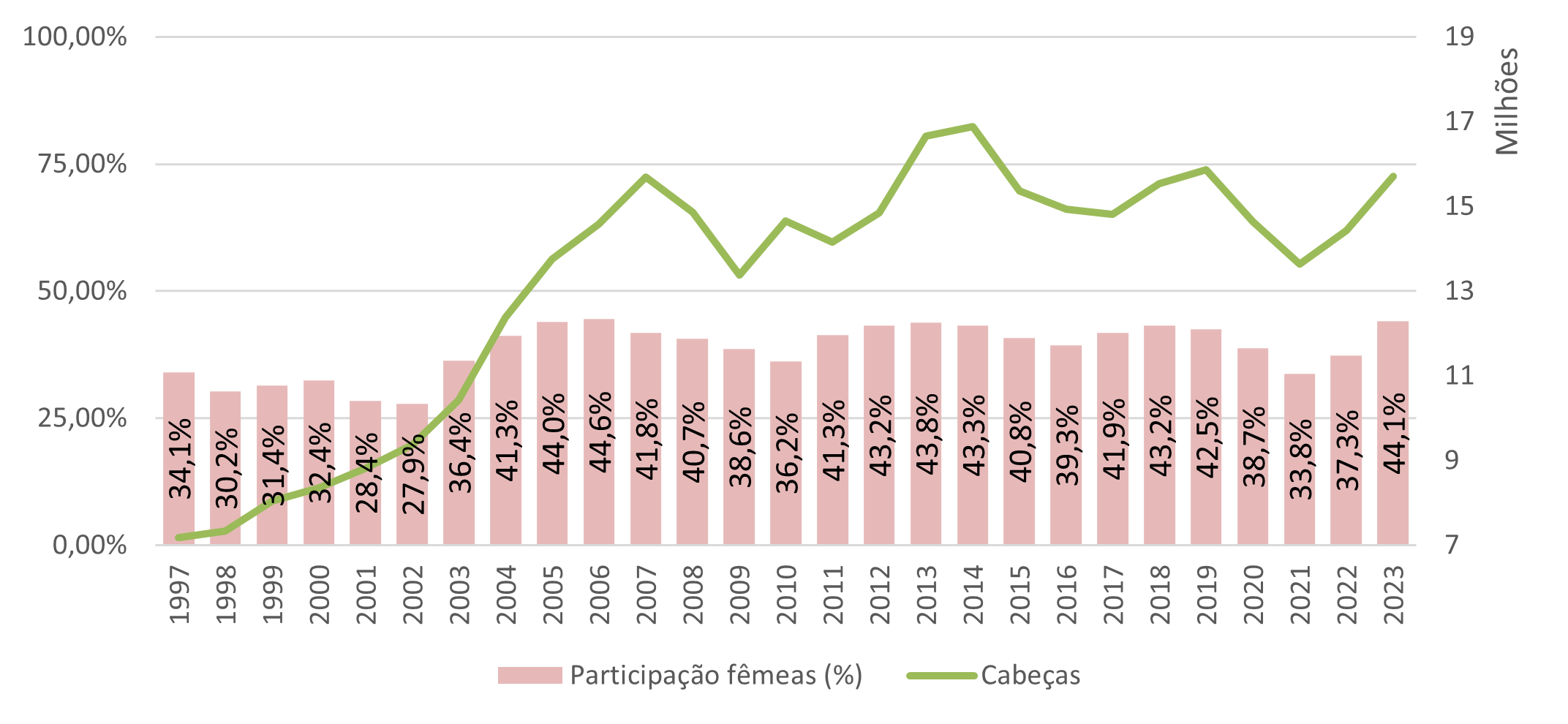 Com a forte retenção de matrizes em 2021, a safra de bezerros foi farta, os preços da categoria caíram, houve desestímulo à cria e mais fêmeas foram abatidas no país. Até junho, os abates registraram 15,7 milhões de cabeças (+8,0% em relação ao mesmo período em 2022), com a participação de 44,1% de fêmeas – o ano com a maior participação de nossa história.