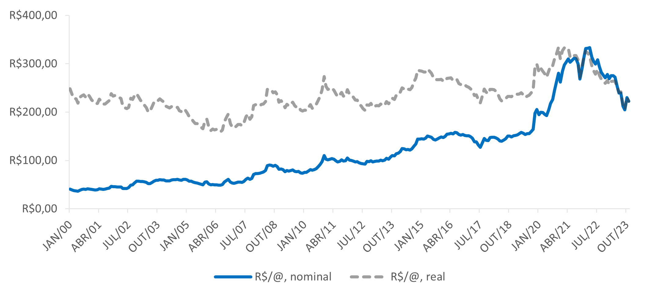 Cotação da arroba do boi gordo (R$), São Paulo, preços nominais e reais