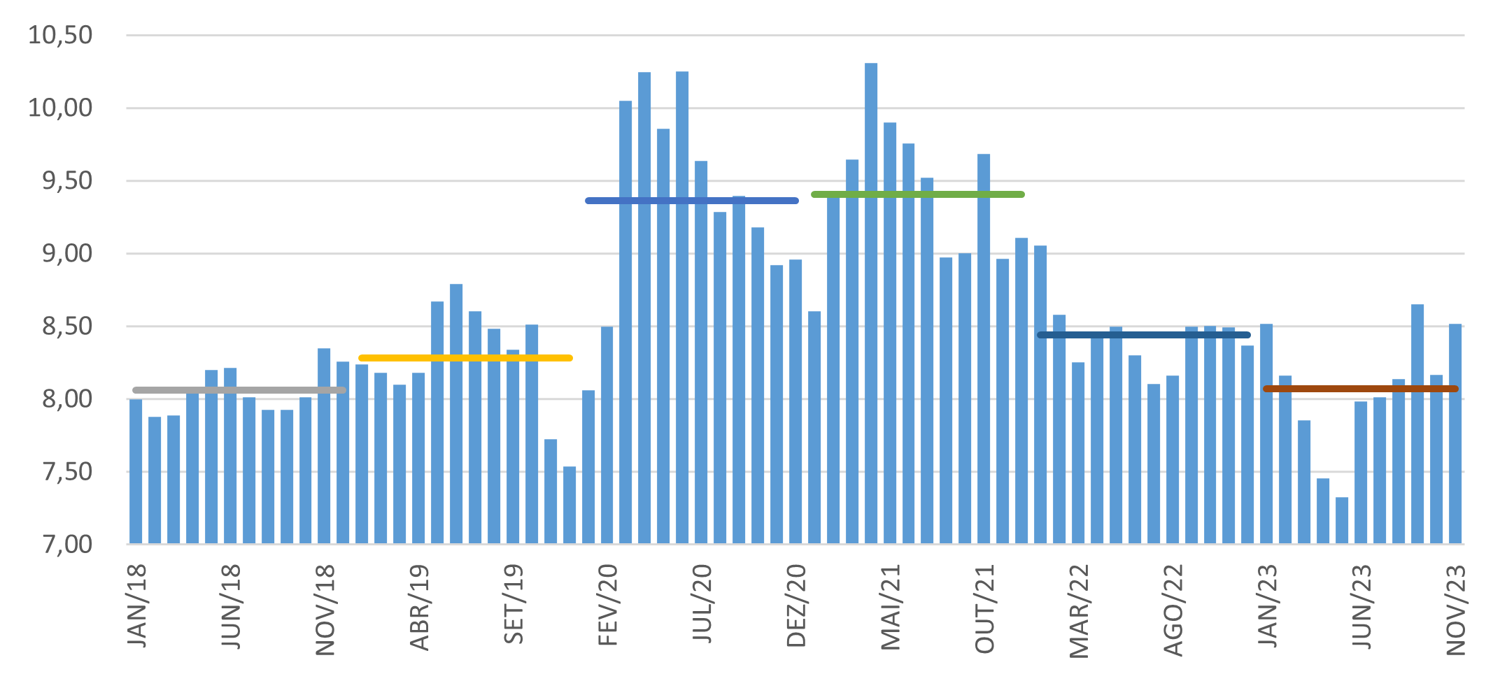 De acordo com o Fundo Monetário Internacional (FMI), ambos deverão seguir com uma inflação acima de 2,5% em 2024 (FMI, em outubro/23) – cenário mais ameno que nos últimos anos (2020/22), mas ainda elevado para países que, entre 2019 e 2020, tinham inflação abaixo de 1,0%.