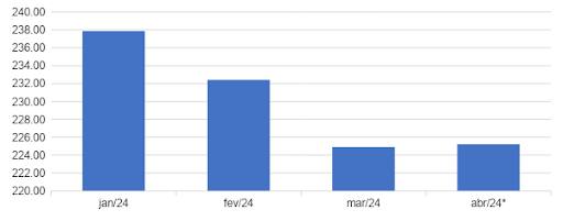 Comportamento de preços da arroba do boi gordo no primeiro quadrimestre de 2024, média mensal, a prazo, descontados os impostos, em São Paulo.