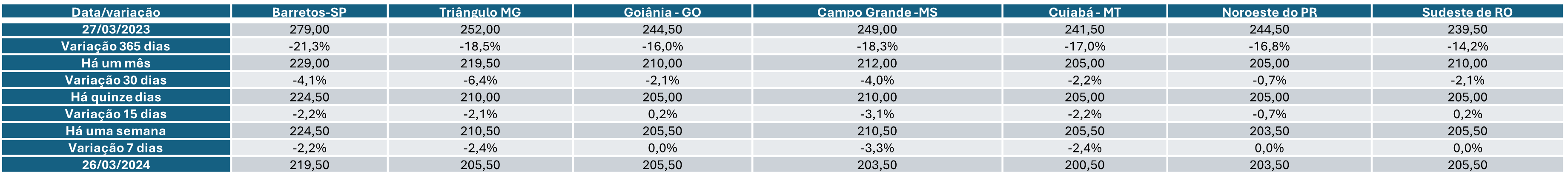 O cenário Brasil afora é semelhante, sem grandes alterações com relação aos últimos meses, com pressão de baixa e com a oferta de boiadas para abate confortável, mas a demanda, principalmente doméstica, está fraca para carne bovina, influenciada também pelo período de Quaresma.