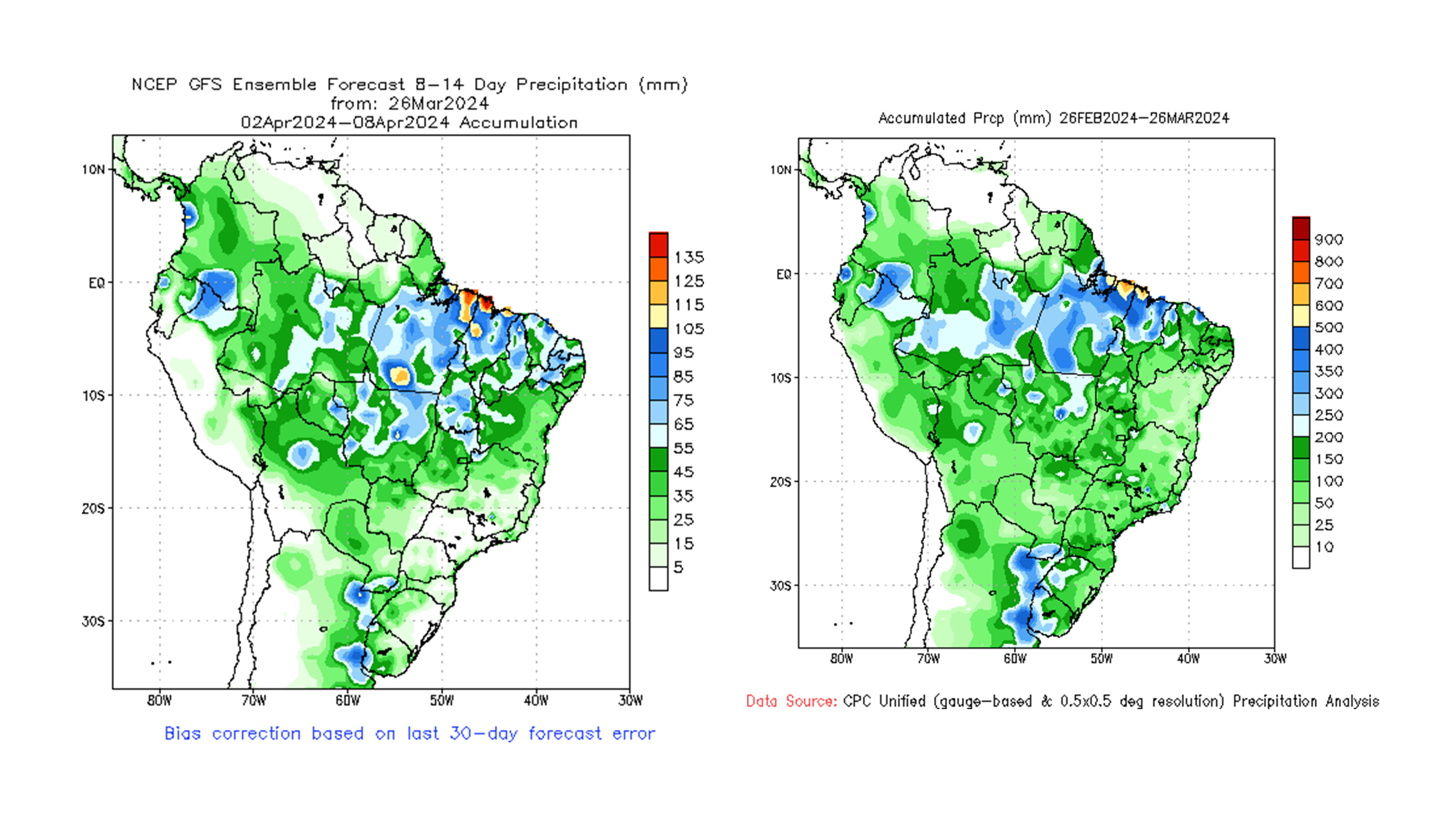 Mas, as águas de março estão fechando o verão e, com chuvas em boa parte do Brasil (figura 4a), a perspectiva é de que as precipitações sigam até o primeiro decêndio de abril (figura 4b).