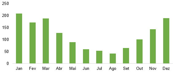 Volume médio mensal de chuvas no Brasil (normal climatológica), de 1981–2010, em milímetros.
