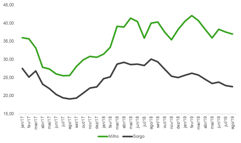 Como exemplo, no acumulado de 2019, os preços do milho caíram 8,6% até agosto e o sorgo teve queda de 12,2%.