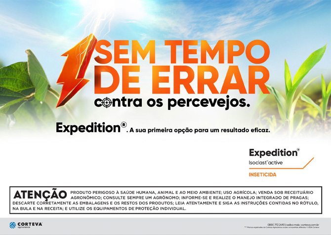 Para colher melhores resultados no controle de percevejos, a primeira aplicação de Expedition® deve ser realizada no início da formação de vagens, ou seja, no canivetinho da soja, e no ponto de palito do milho. Já a reaplicação, na soja, deve ser feita quando atingir o nível de controle entre 0,5 a 1,0 percevejo por pano de batida, enquanto no milho deve ser feita 5 dias após a primeira aplicação.