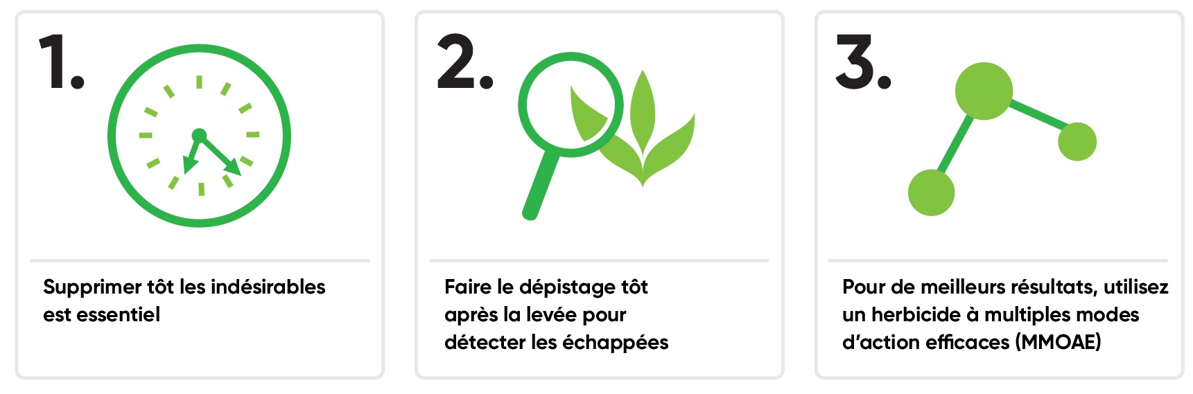 La suppression des indésirables dans le soya IP repose sur les mêmes principes clés que ceux d’une culture tolérante aux herbicides (TH) :