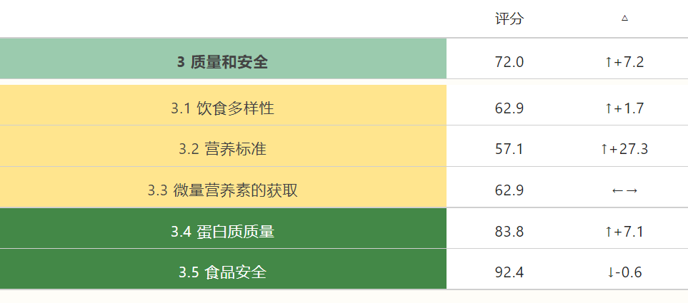 —— 其中,中国在蛋白质质量(得分83.8)和食品安全(得分92.4)这两项指标中获评“非常好”。
