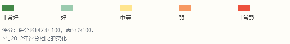 今年的报告中,中国以74.2的综合分数在全球113个国家和地区中排名第25位,(较去年排名大幅提升9位)在亚太地区23个国家和地区中排名第4位,(且每项分类指标均超过亚太平均水平)。