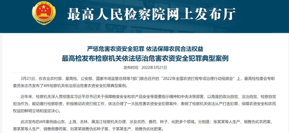 3月21日,在农业农村部、最高人民检察院、公安部、国家市场监管总局等7部门联合召开的“2022年全国农资打假专项治理行动视频会”上,最高检检委会专职委员张志杰发布了4件检察机关依法惩治危害农资安全犯罪典型案例。其中侵权假冒科迪华农药品牌案件——“张某某等人生产、销售伪劣农药案”入选为第一案例。