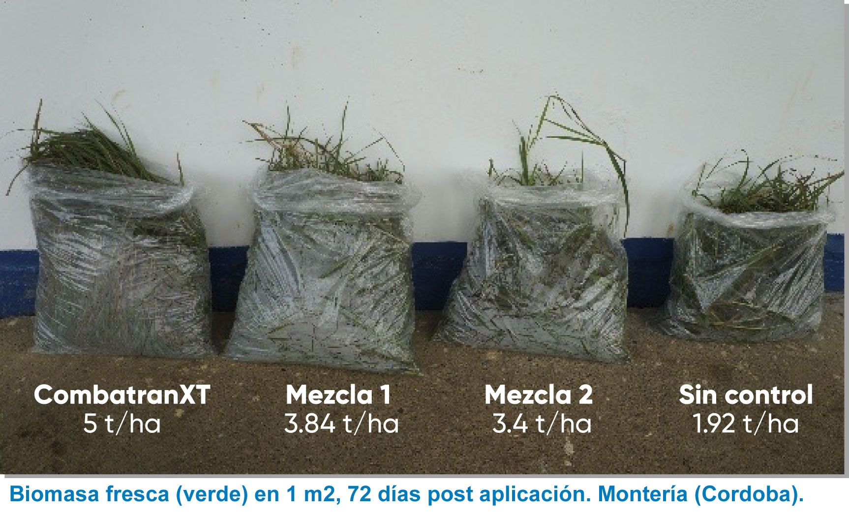 La foto correspondiente a la Finca 1 (Córdoba) se observa que dos meses después de aplicar los herbicidas, la biomasa de pasto Colosuana (Bothriochloa pertusa) disponible en 1 m2 de suelo era considerablemente mayor en el caso de CombatranXT™. Este patrón se repitió en las cuatro localidades y se explica tanto por la eficacia herbicida como por la menor afectación al pasto (selectividad).