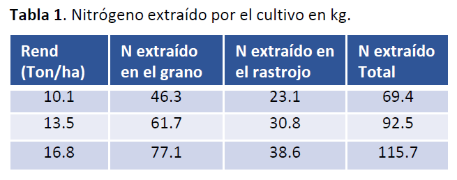 • En la (Tabla 1) se muestran las cantidades aproximadas de Nitrógeno extraído en el grano y en el rastrojo (es decir, la cantidad mínima de Nitrógeno para el crecimiento del cultivo).