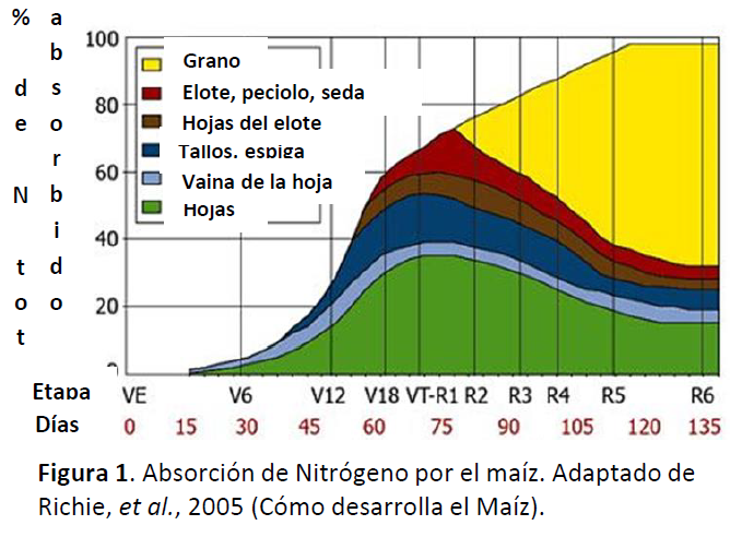 • El maíz generalmente requiere la mitad del suministro del N entre V8 y VT, un periodo que abarca sólo 30 días, dependiendo de la temperatura y condiciones de humedad. Recargas de N entre V4 y V6 son para tener algún margen de seguridad en caso las condiciones de clima o suelo retrasen la aplicación de N o el movimiento hacia las raíces. La (Figura 1) muestra también que las necesidades de la planta no terminan con el espigado, sino que aproximadamente un tercio de los requerimientos de N son necesarios durante el periodo reproductivo (llenado de la mazorca).
