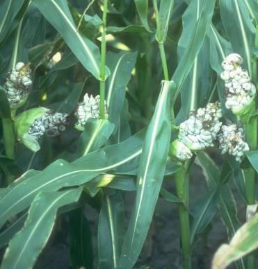 Später brechen die Beulen auf und entlassen Massen an schwarzbraunen Sporen. Die Beulen finden sich an den Blättern, den Stängelknoten, am Kolben und an der Rispe.