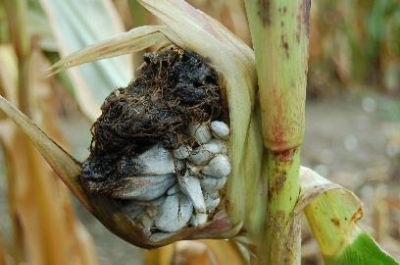 Maisbeulenbrand ist die häufigste Krankheit im Mais. Er tritt als kleinere oder größere Beulen mit einer silbrig glänzenden Haut auf.